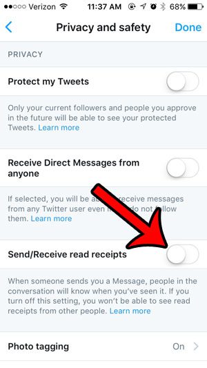 ステップ6:右側のボタンをタップします読み取り領収書を送信/受信しますそれをオフにします。ボタンの周りに緑の陰影がない場合、設定は無効になります。下の写真でオフになっています。その後、タップします終わり画面の右上隅にあるボタンは、変更を保存してメニューを終了します。