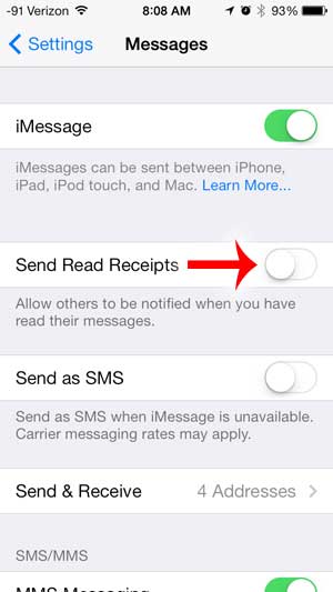 ステップ3:右側のボタンをタッチします読み取り領収書を送信しますそれをオフにします。機能がオフになったときに、ボタンの周りに緑色のシェーディングはありません。