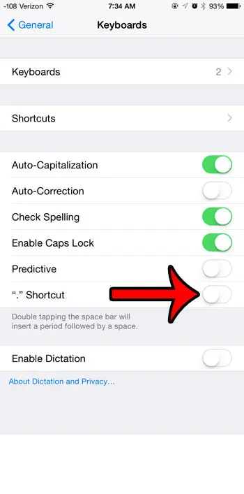 - ステップ4:右側のボタンをタップします「。」ショートカットそれをオフにします。ボタンの周りに緑色のシェーディングがないときに、オフになっていることがわかります。たとえば、この設定は下の画像で無効になっています。