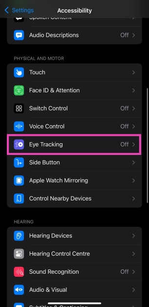 ステップ4:下にスクロールして選択しますアイトラッキング。