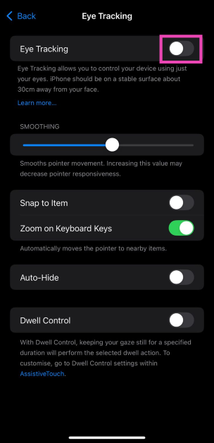 アイトラッキングは、新しいiOS 18アップデートで展開される新しいアクセシビリティ機能の1つです。名前が示すように、この機能により、ユーザーはiPhoneをナビゲートし、目だけを使用してコマンドとアクションを実行できます。身体障害のあるユーザー向けに設計されたアイトラッキングは、ユーザーの眼球運動に従ってiPhoneを調整します。デバイス上の機械学習は、この面で重要な役割を果たします。この機能を使用して収集されたすべてのデータは、デバイスで保護されています。