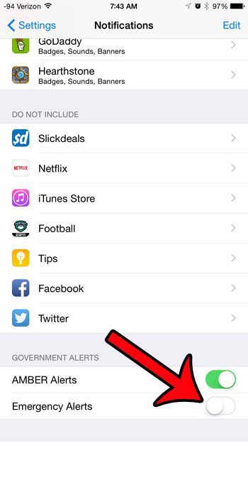 ステップ3:このメニューの下部までスクロールし、次に右側のボタンをタップします緊急警報それをオフにします。