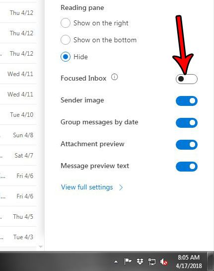 ステップ3:右側のボタンをクリックしますフォーカスされた受信トレイ。受信トレイビューは変更を加えるとすぐに変更されるため、変更が好きかどうかを確認できます。気に入らない場合は、Focused Inboxボタンをもう一度クリックして、前の設定に戻ります。