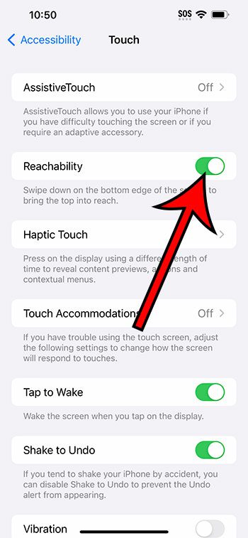 iPhone 14の到達可能性の設定を有効にすることができます設定>アクセシビリティ>タッチ>その後、タップします到達可能性ボタン。