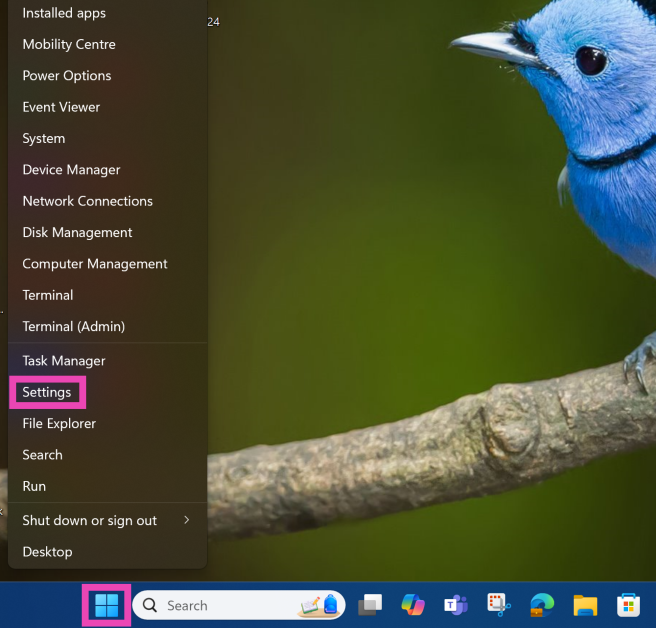 ステップ1:右クリックしますWindowsアイコンタスクバーで選択します設定。