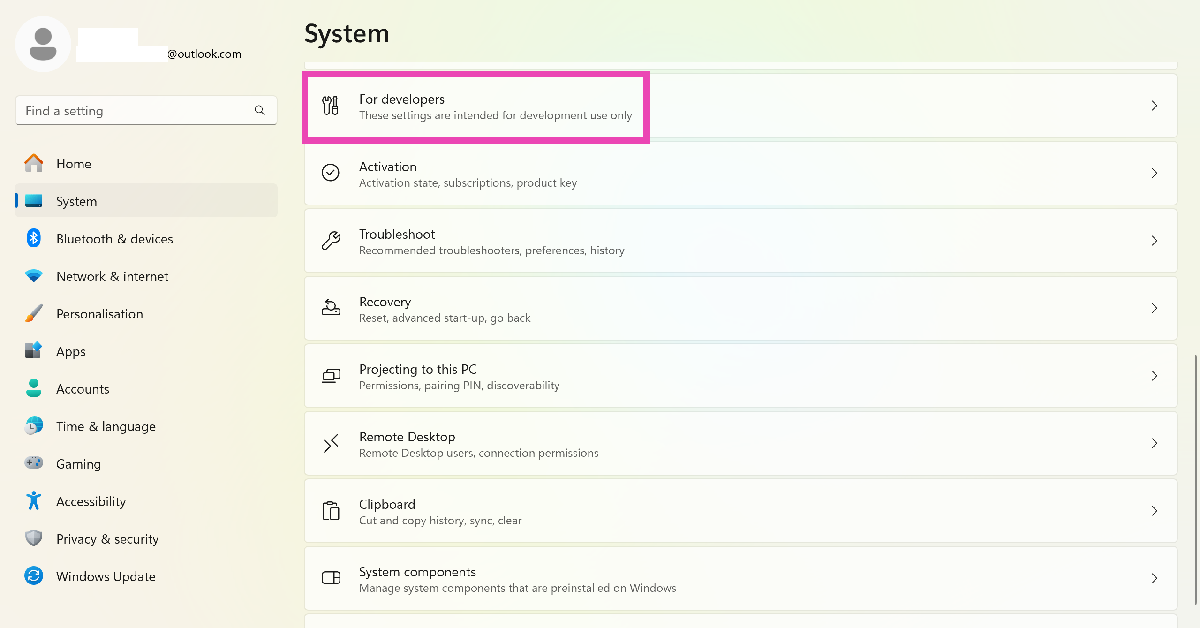 ステップ2:に切り替えますシステムタブと選択開発者向け。
