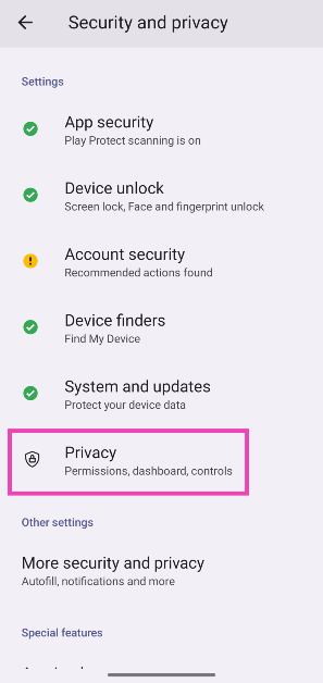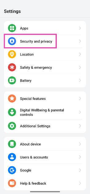 ステップ1:行きます設定選択しますセキュリティとプライバシー。