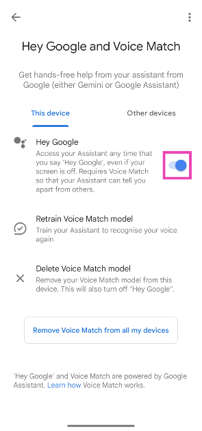 行きますGoogle>設定> Google Assistant> Hey Google&Voice Match「Hey Google」の横にあるトグルスイッチをオフにします。