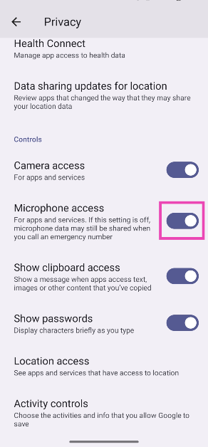 ステップ3:下にスクロールしてオン/オフのトグルスイッチを次のようにしますマイクアクセス。
