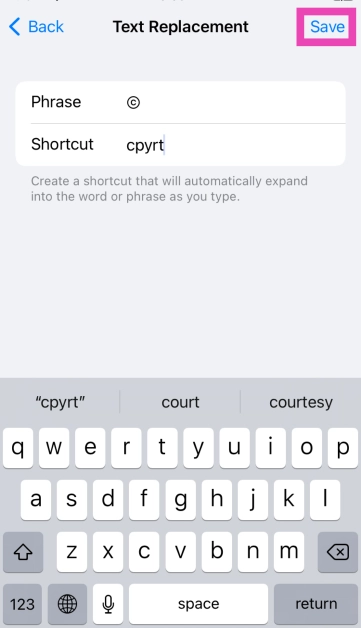 ネイティブのiPhoneキーボードには著作権記号がありません。テキストの交換を使用して、選択した特定の単語を入力すると、その記号を挿入できます。 GboardやSwiftKeyなどのサードパーティアプリを使用することもできます。