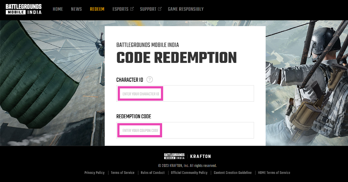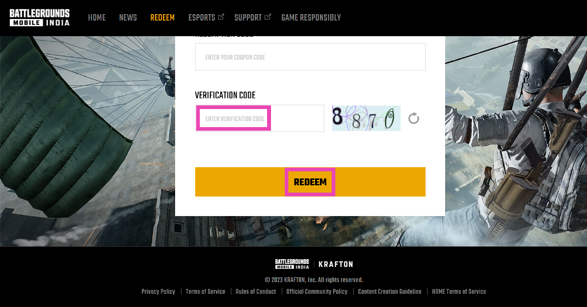 BGMIのWebサイトに移動し、「Redeem」をクリックして、文字IDを入力し、その後にRedeemコードを入力します。画面に表示されている検証コードを入力し、Enterを押します。