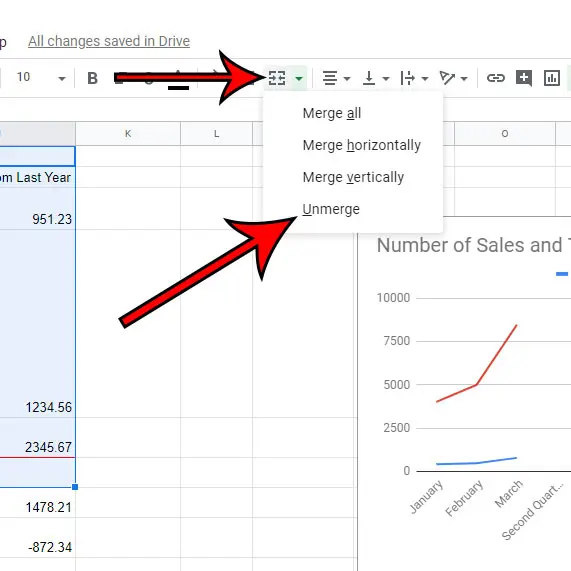 Googleシートに単一のセルをマスターするか、複数のセルをマスターする必要がある場合は、次に、マージされたセルを選択し、[マージ]タイプの矢印を選択してから、マージオプションを選択します。。