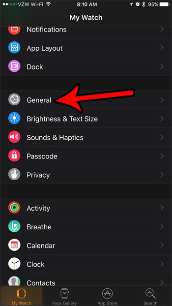 時計オペレーティングシステムの新しいバージョンでは、「アクセシビリティ」メニューがこのLOPレベルのナビゲーションに移動されたため、Generalを選択する必要はもうありません。 「私の時計」をタップした直後に「アクセシビリティ」メニューオプションがあります。