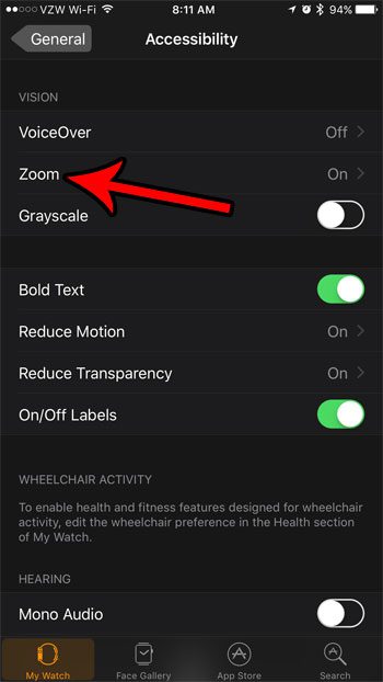 を選択することから始めます私の時計'タブ、次にナビゲートします'アクセシビリティ、「選択」ズーム、 'そして最後に、次のボタンをタップします'ズーム'それを切り替えるために。