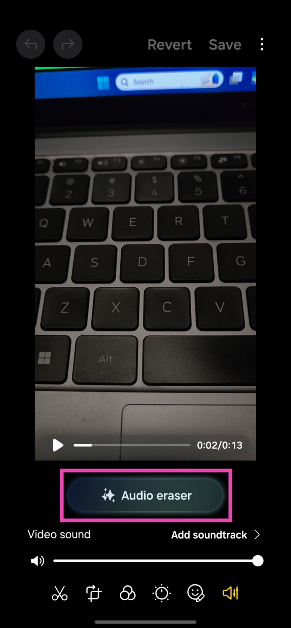 ネイティブギャラリーアプリでビデオを開き、画面の下部にある鉛筆アイコンをタップし、画面の右下隅にあるスピーカーアイコンを押して、「オーディオ消しゴム」をタップします。お使いの携帯電話では、さまざまなサウンドソースについてビデオを分析します。ソースが画面に表示されたら、それらを1つずつタップして、ミックスでボリュームを調整します。