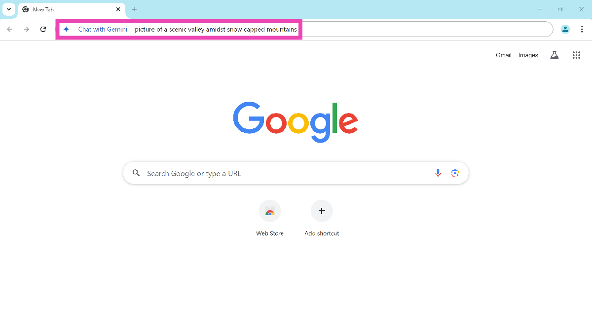 PCでChromeを起動し、アドレスバーをクリックし、 @と入力し、Geminiを選択します。プロンプトを入力して、Enterを押します。