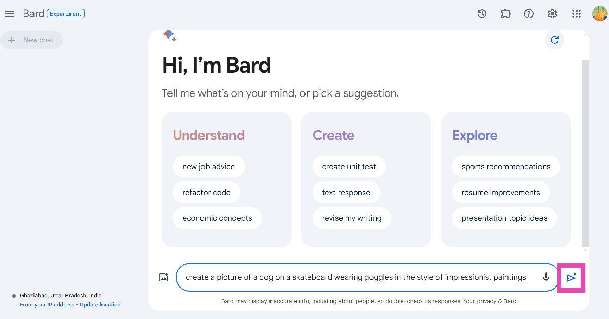 ステップ2:あなたを入力してくださいプロンプトチャットボックスの画像用。プロンプトが「Draw A ..」、「Generate a Picture ..」、「Image ..を作成」、またはそれらの線に沿って何かから始まることを確認してください。あなたのプロンプトはあなたが吟遊詩人を望んでいることを明確にする必要があります画像を生成します。