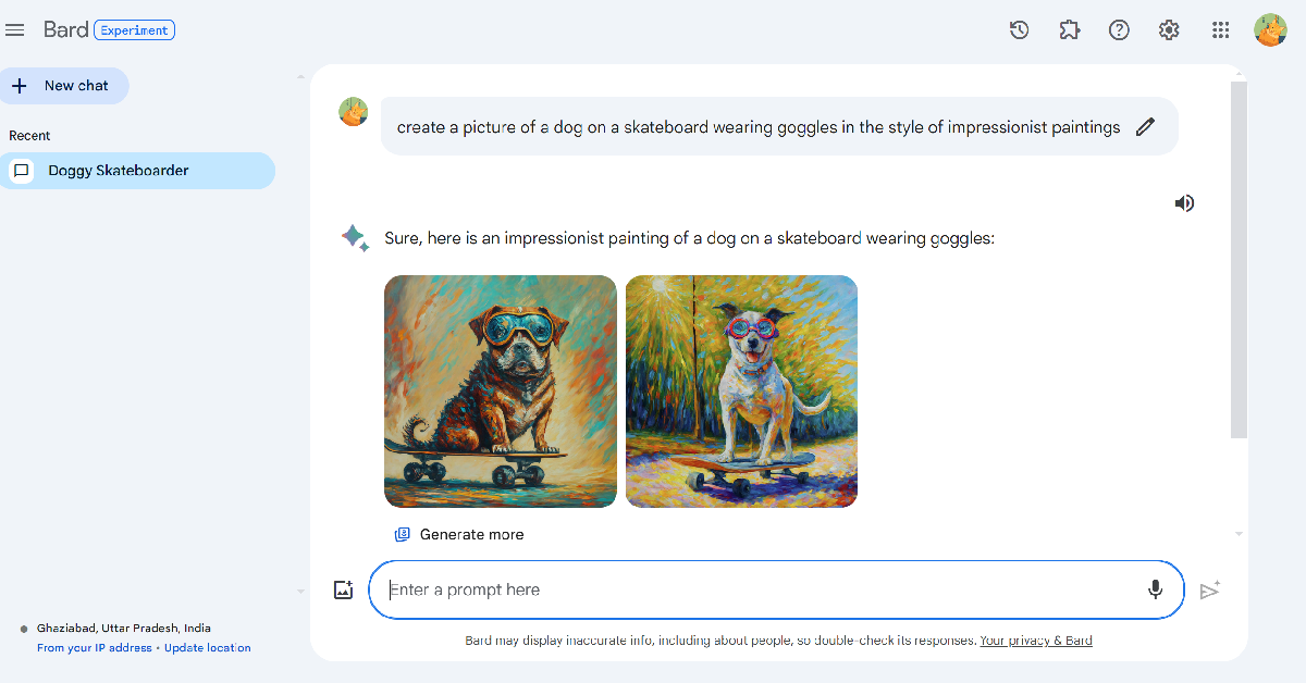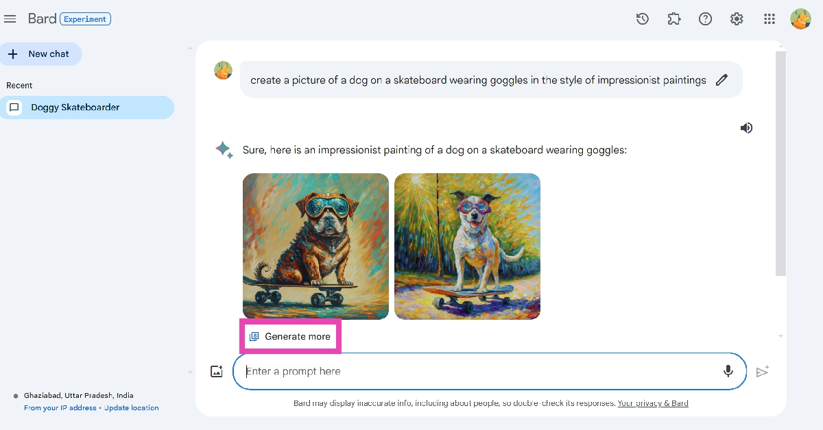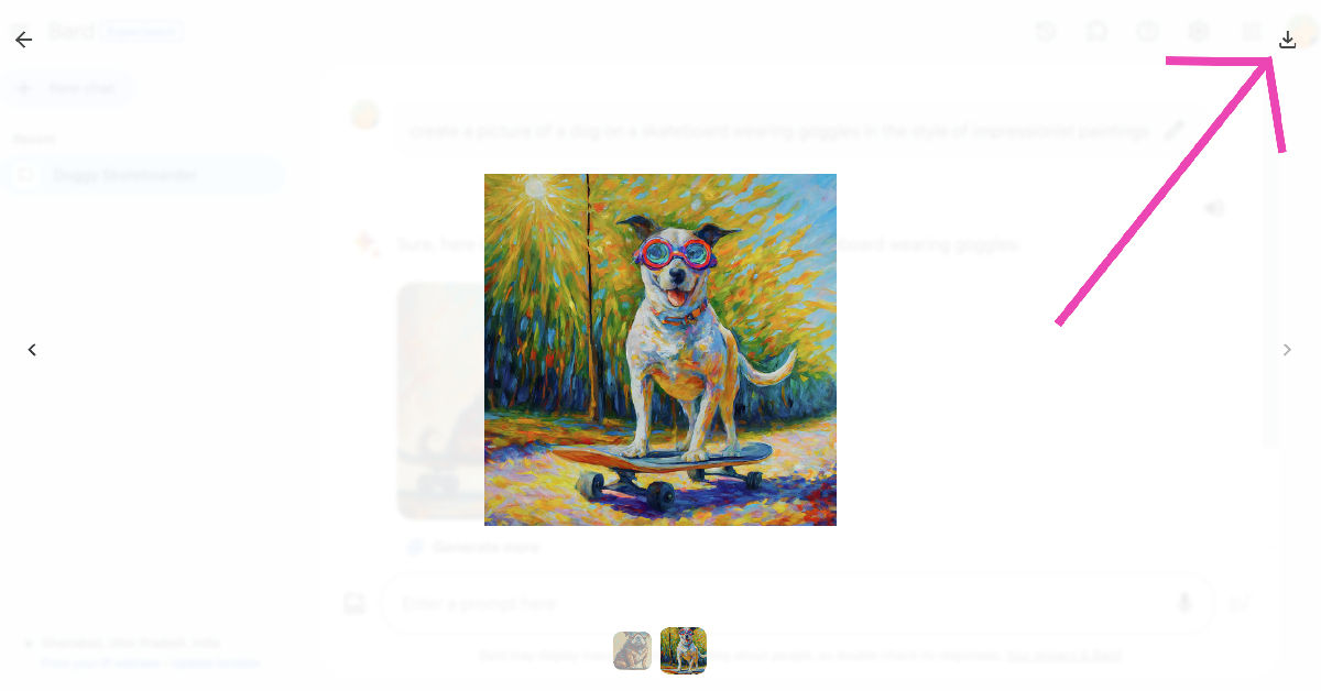 ステップ5:バードが生成します2つの画像プロンプトに基づいています。画像をクリックして展開します。現在、Google Bardはでのみ画像を生成できます512px x 512px解決。