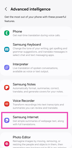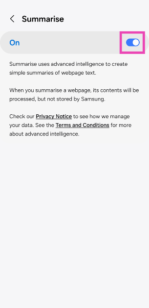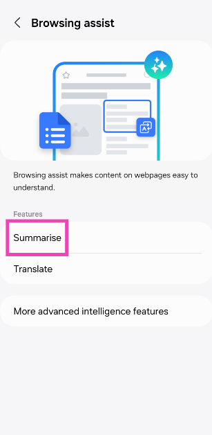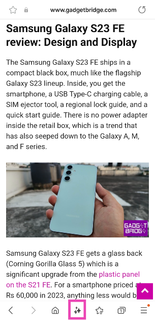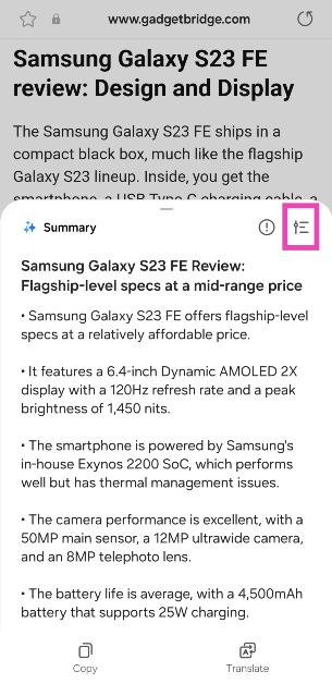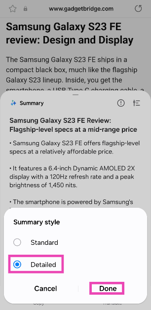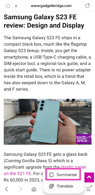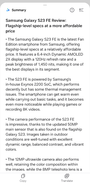 もう1つのクールなGalaxy AI機能は、Webページの要約です。長い記事を読むのに十分な時間がない場合は、AIアイコンを押してWebページの概要を生成できます。ブラウザアプリは、詳細な要約も生成するオプションを提供します。この要約を好きな言語に翻訳できます。