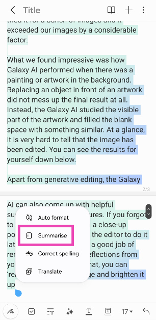 ステップ4:タップします要約します。 Galaxy AIを使用して、テキストを自動フォーマット、スペルチェック、翻訳することもできます。要約機能には単語の制限があります。
