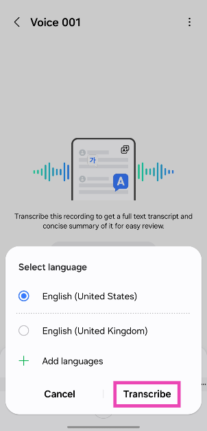 ステップ3:を選択します言語そしてヒット転写します。ダウンロードする必要がある場合があります言語パックこのために。