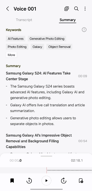 新しいPixelスマートフォンと同様に、Samsungのネイティブボイスレコーダーアプリは、Voice Noteを転写できるようになりました。音声録音に複数のスピーカーがある場合、それに応じて分類されます。 Galaxy AIは、転写されたテキストに冗長性と文法エラーがないことを確認するために最善を尽くします。ただし、スピーチが明確に明確でない場合、いくつかのエラーが忍び寄ることができます。ありがたいことに、これらのエラーは簡単に無視できます。 Galaxy AIは、あなたのために転写されたテキストを要約し、読みやすい方法でフォーマットします。重要と思われるトピックに関連するキーワードを生成します。キーワードをタップすると、テキストで言及されている部分にあなたを使用します。