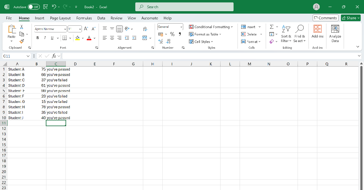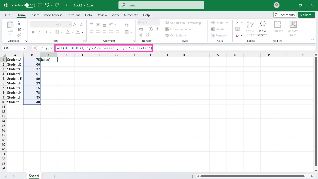 = if(b1:b10> 39、「あなたはテストに合格しました」、「あなたはテストに失敗しました」)