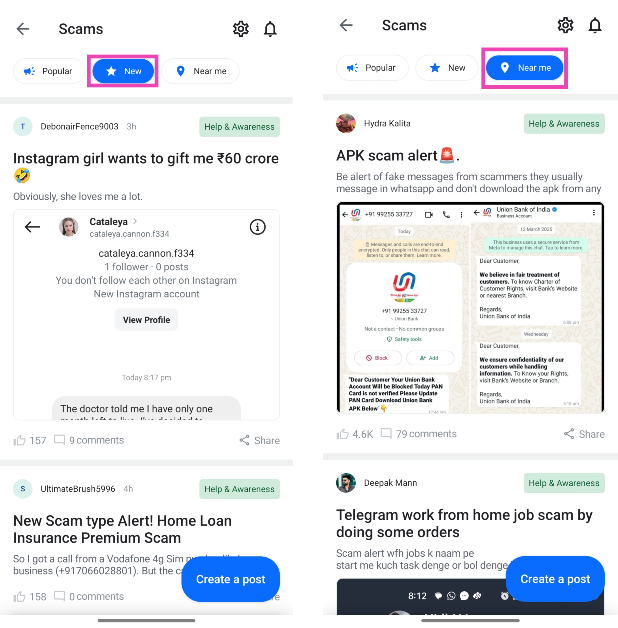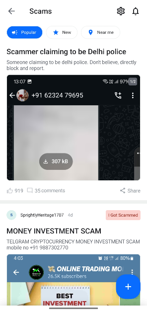 ScamFeedは、TrueCallerアプリ内の特別なセクションで、ユーザーは悪意のある詐欺と経験を共有できます。人気、時間、場所で投稿を並べ替えることができます。上昇する詐欺を知っている場合は、TrueCallerコミュニティと共有することを選択できます。