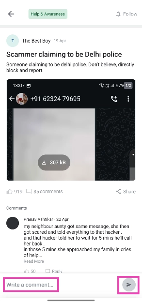 名前が示すように、ScamFeedは局所詐欺に関する投稿の転がり供給です。ユーザーは投稿を作成して、関連する画像を追加できます。投稿が公開されると、他のTrueCallerユーザーはそれを好み、返信を残すことができます。 ScamFeedは、その投稿にチェーンのコメントを許可することで議論を促進します。