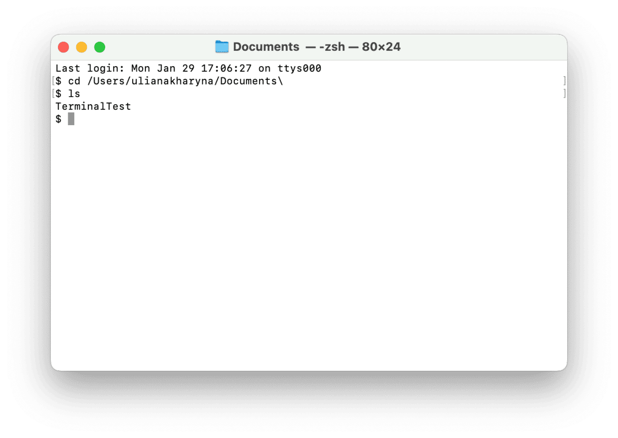 端子ウィンドウで、タイプcd ~/Documents/TerminalTestreturnを押します。次にタイプしますls- 「TerminalTestFile」がリストされている必要があります。