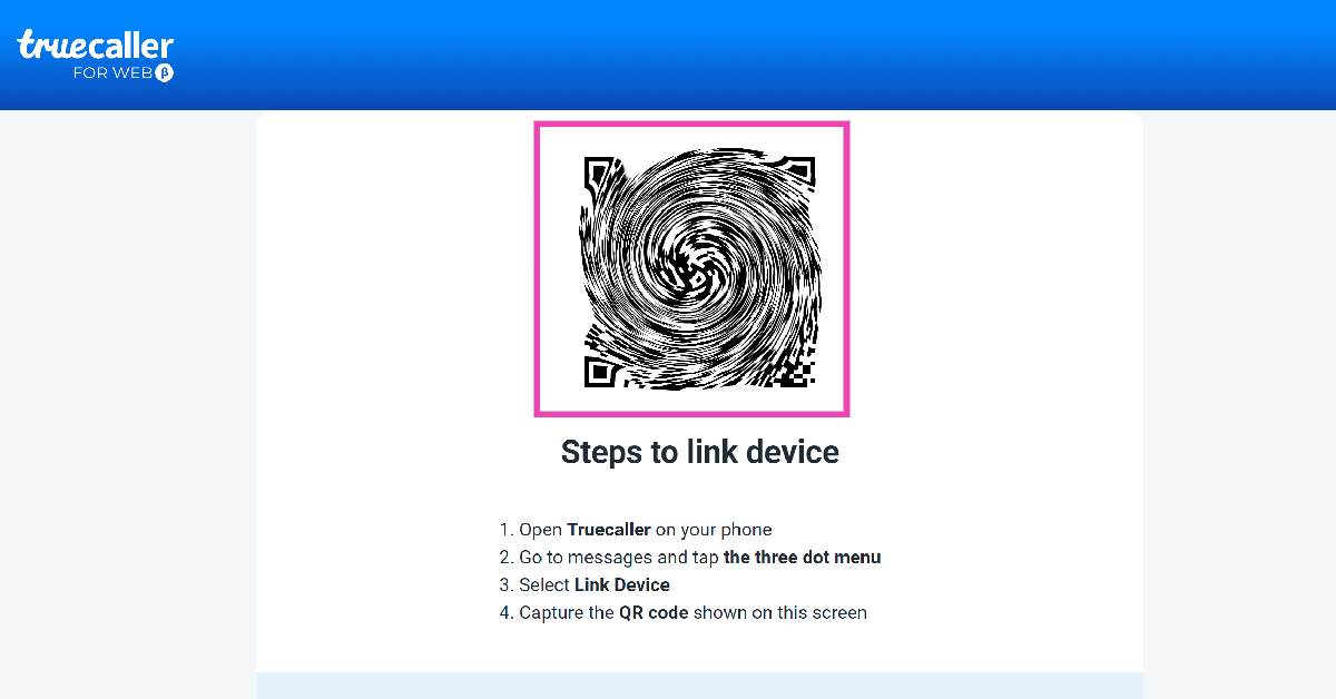 携帯電話でTrueCallerアプリを起動してメッセージ> ellipses>リンクデバイス。次に、に行きますhttps://web.truecaller.com/linkdevicePCで、携帯電話を使用してQRコードをスキャンします。