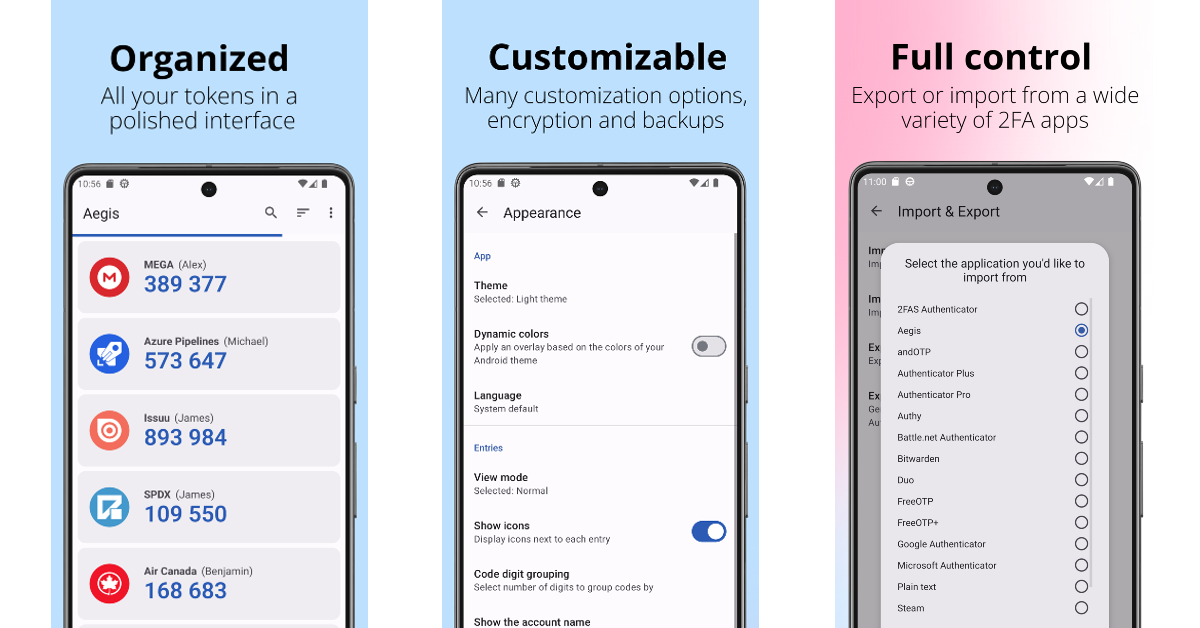 追加費用なしでTwitterの2FAを有効にするために使用できる最高のオープンソース認証アプリの1つです。このアプリは、認証のための2つの業界標準アルゴリズム、HOTPとTOTPをサポートしています。アプリがGoogle Authenticatorをサポートしている場合、Aegisもサポートします。パスワードでイージスを保護して、他の誰も認証コードにアクセスしないようにすることができます。 AEGICについて私たちが本当に気に入っているのは、複数の2FAコードを簡単に保存できるようにするカラフルでアクセス可能なインターフェイスです。