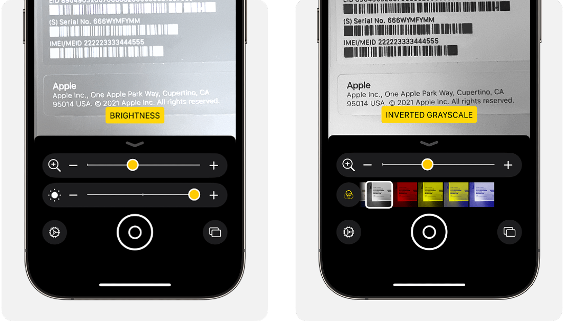 iPhoneのマグニファイアアプリを使用して、オブジェクトまたはテキストにズームインしてコントラストと明るさを調整できます。 Fine Printが読みにくいと感じた場合、このアプリは役に立ちます。視覚障害のある人の場合、拡大器アプリは周囲の日常のオブジェクトを検出できます。