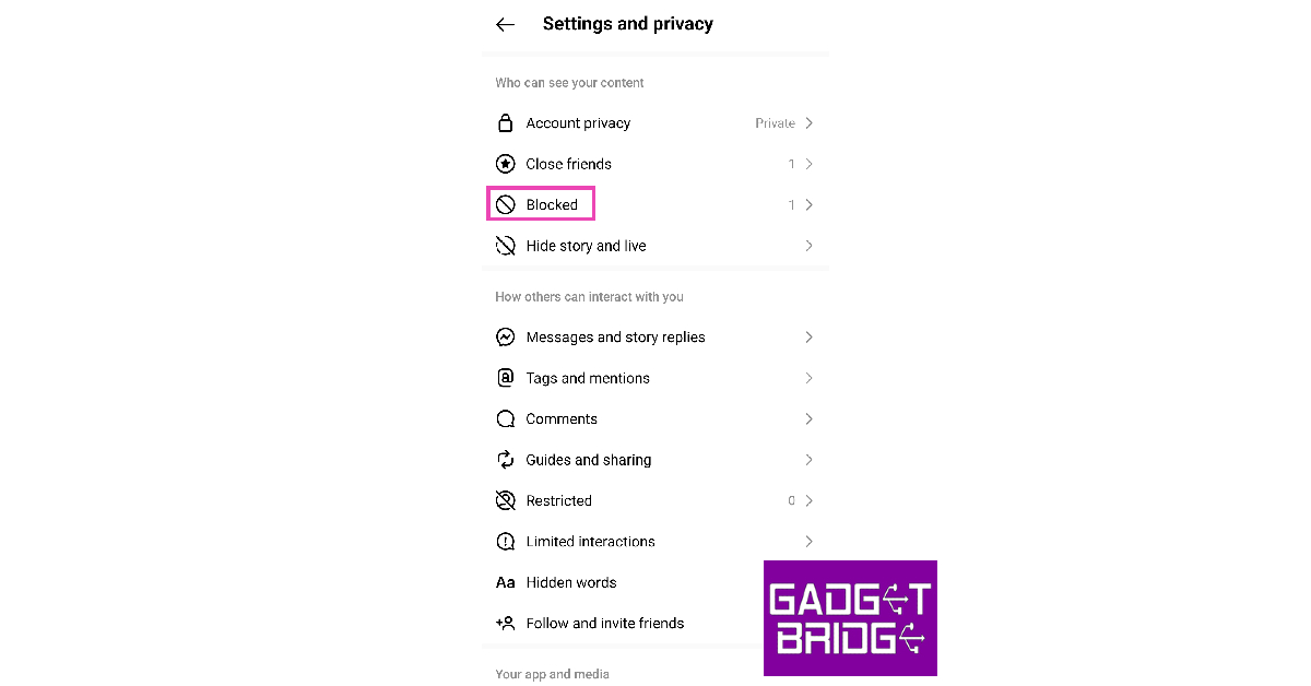 行きますプロファイル>メニュー>設定とプライバシー>ブロックされていますアカウントを表示するには、Instagramでブロックしました。