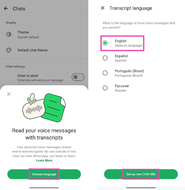 ほとんどのサービスは、転写目的でAIにシフトしていますが、プラットフォーム上でエンドツーエンドの暗号化を維持するWhatsAppの解決は、このタスクの計算がデバイスでのみ行われることを意味します。 Metaはまだ正式にこれを確認していませんが、WhatsAppでは、音声ノートの転写を使用し始める前に、ユーザーに言語パックをダウンロードする必要があります。これは、ユーザーデータが転写のためにサードパーティサーバーにエクスポートされないことを意味します。
