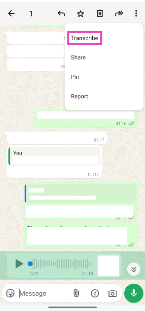 whatsappの音声ノートの転写を有効にすることができます設定>チャット「音声メッセージトランスクリプト」のトグルスイッチをオンにします。それが完了したら、ボイスノートをタップして押し続け、「転写」を押してテキストに変換します。