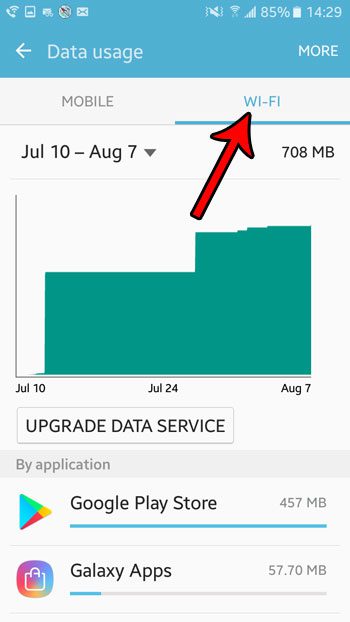 ステップ6:タップしますWi-Fi画面の上部にあるタブ。別の日付範囲を選択する日付を選択できることに注意してください。さらに、画面上にスクロールすると、そのWi-Fiデータを使用しているアプリの詳細な内訳が提供されます。タップすることができます携帯画面の上部にあるタブで、モバイルデータの使用に関する情報を表示します。