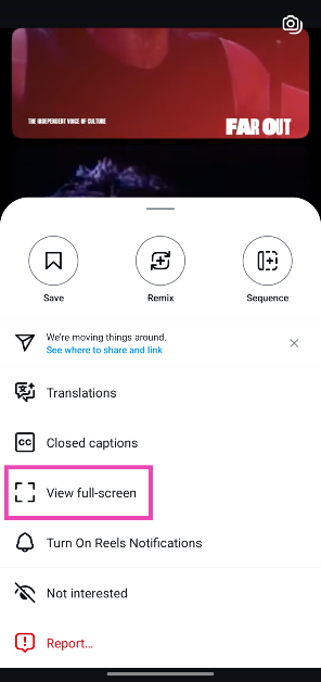 Instagramのリール用のフルスクリーンモードでジョブが完了しますが、1つの重要な欠点があります。リールをスクロールするときは、すべてのビデオのフルスクリーンモードを個別に有効にする必要があります。これにより、リールを叩くときの視聴体験にダンパーがかかります。フルスクリーンオプションは追加のオプションに隠れているため、コンテンツを拡張するにはいくつかのタップがかかります。