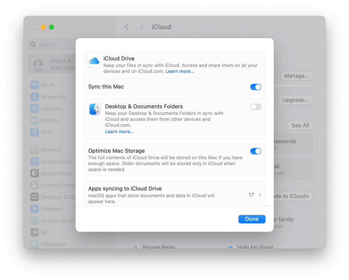次の修正は、組み込み機能を使用することです。便利なオプションの1つは、Macストレージを最適化するという名前です。このように機能します。電源を入れると、iCloudドライブの完全なコンテンツは、十分な空きスペースがある場合にのみMacに保存されます。スペースが低く走り始めると、古いファイルがMacから削除され、iCloudドライブにのみ保存されます。その後、必要なときにいつでもダウンロードできます。これをオンにする方法は次のとおりです。