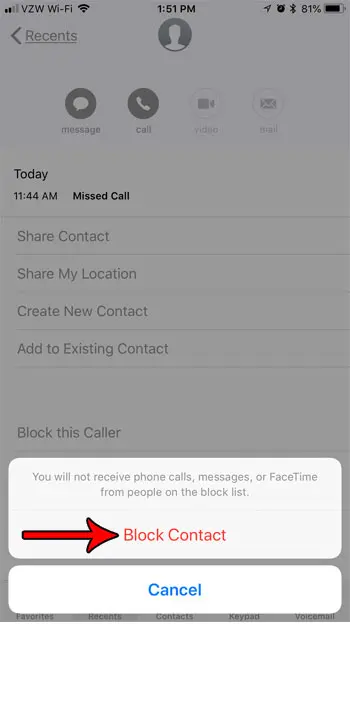 ステップ5:タップしますブロック接点ボタンは、電話、テキストメッセージ、またはFaceTimeでこの番号をブロックすることを確認します。