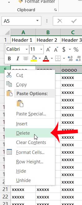 ステップ3:スプレッドシートの左側にある行番号を右クリックし、[消去ボタン。
