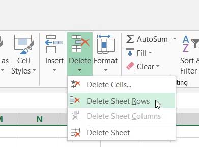 また、選択して行を削除して、家ウィンドウの上部にあるタブ、クリックします消去、クリックしますシート行を削除します。