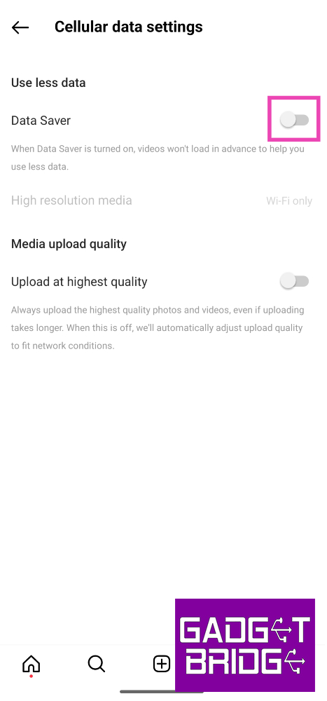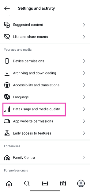 Instagramでデータセーバーをオフにするには、設定とプライバシー>データの使用とメディアの品質トグルスイッチをオフにしますデータセーバー。