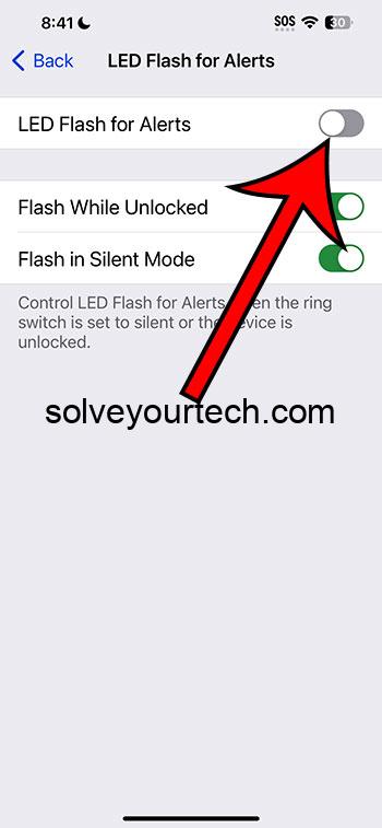 「アラートのためのLEDフラッシュ」の横にあるスイッチを見つけて切り替えます。