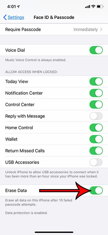 この記事の手順は、iOS 13.3.1のiPhone 11で実行されました。この設定を有効にすることにより、10回のパスコードの試行が10回失敗した後、iPhoneがすべてのデータを消去するオプションをオンにすることになります。