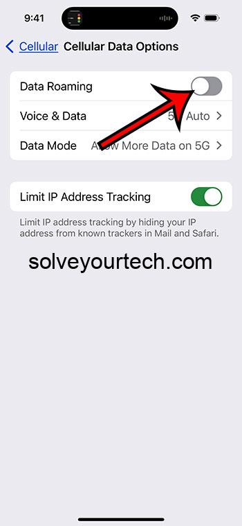 「データローミング」を切り替えることで、iPhoneにホームネットワークの外にいるときに携帯電話データを使用しないように指示しています。これは、データローミングに関連するこれらの高い料金を回避するための重要なステップです。