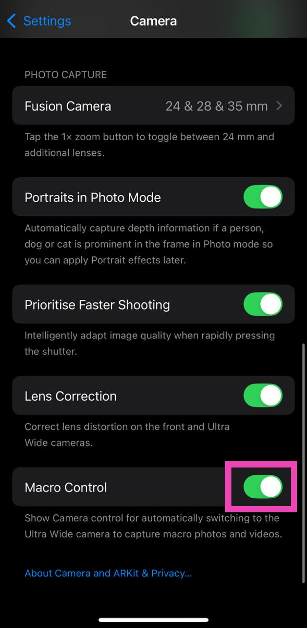 設定に移動し、カメラを選択し、マクロコントロールの横にあるトグルスイッチをオフにして無効にします。