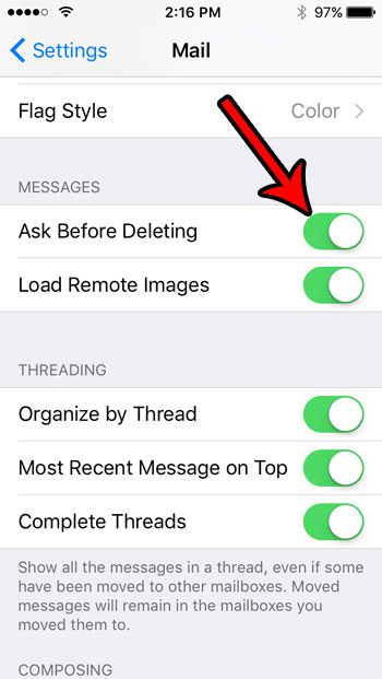 ステップ3:右側のボタンをタップします削除する前に尋ねてください電源を入れます。 iPhoneは、ボタンの周りに緑色のシェーディングがあるときに電子メールを削除する前に確認を求めます。下の写真でこのオプションを有効にしました。