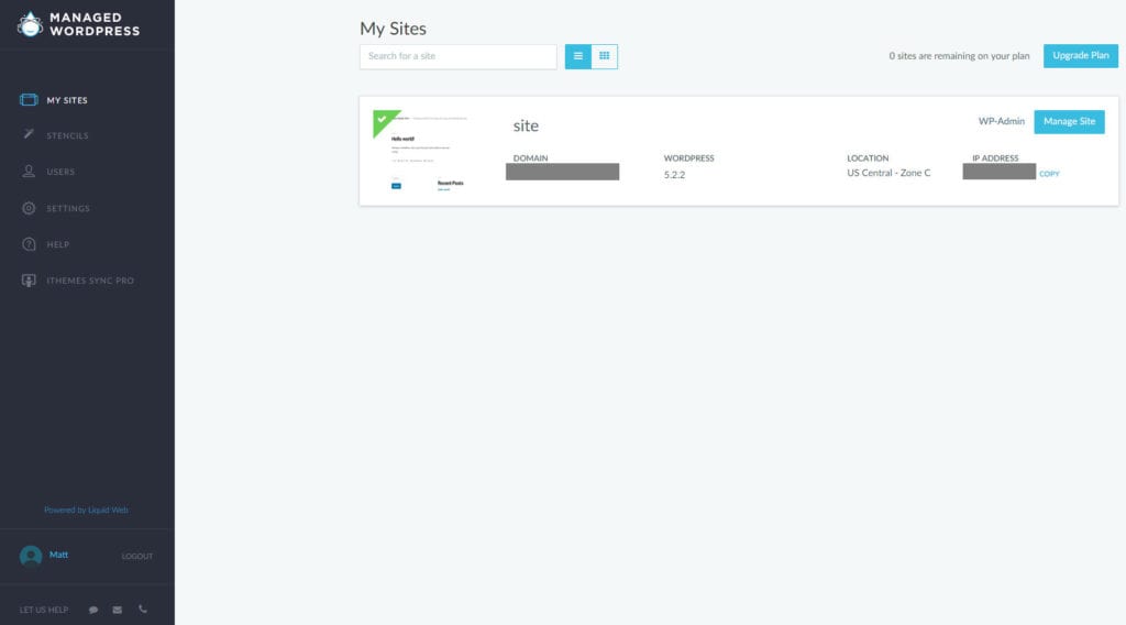 Liquid Webを使用した新しい管理されたWordPressホスティングアカウントにサインアップした後、下の写真に示されているカスタムコントロールパネルが迎えられます。 WordPressのインストールが作成されるのにサインアップしてから数分かかることに注意してください。さらに、Liquid Webの誰かから電話または電子メールを受け取って、ホスティングプラットフォームに歓迎し、質問に答えることができます。