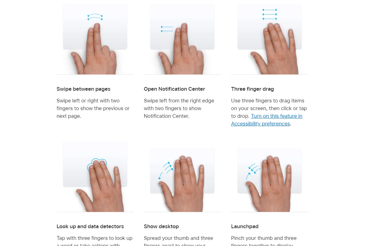MacBookトラックパッドは、一般的なタスクのショートカットを提供するさまざまなジェスチャーを提供し、マウスなしでMACを制御しやすくします。これらのジェスチャーは、単純なクリックから、より複雑なマルチタッチの操作にまで及びます。